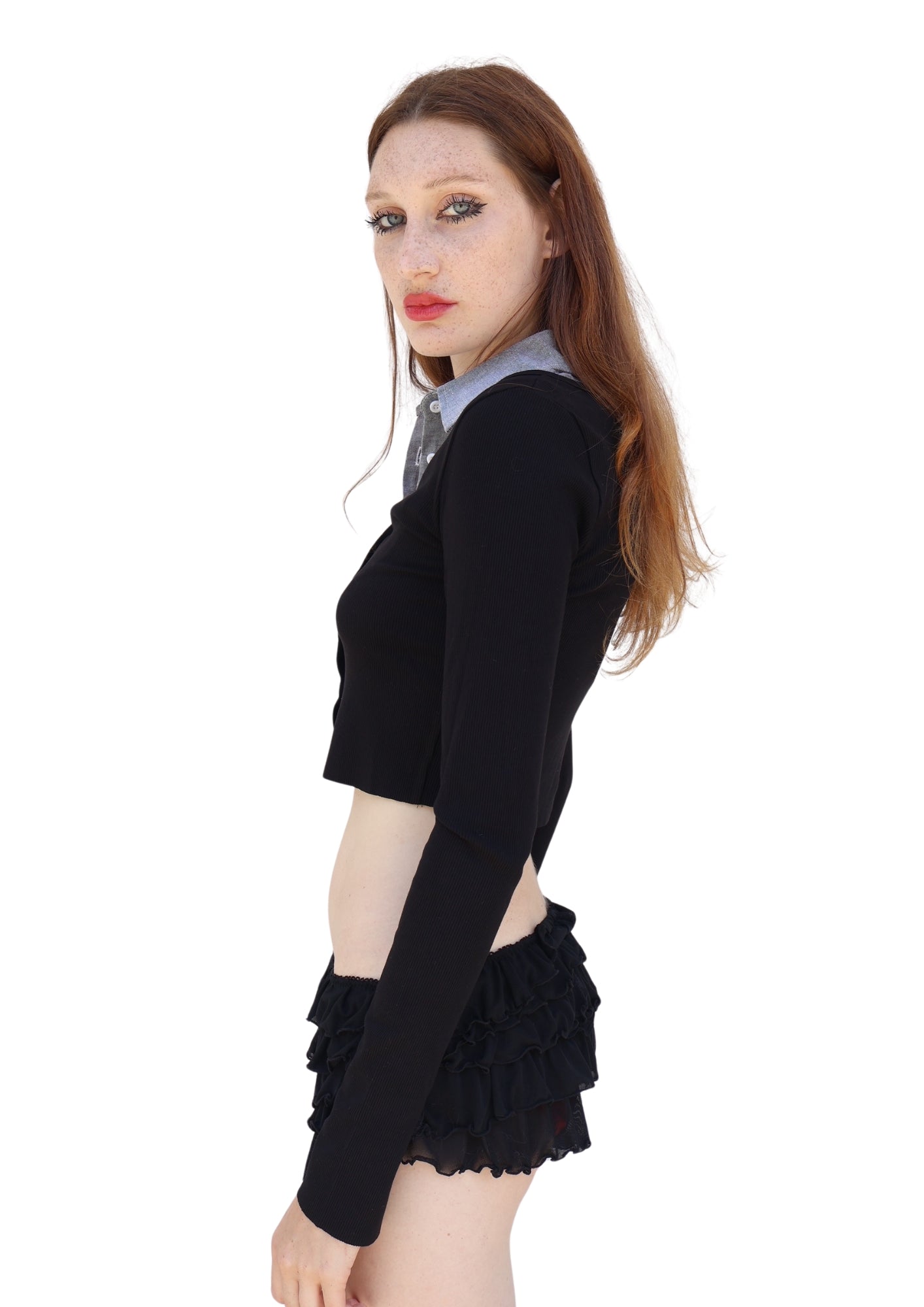 Cropped light weight sweater with an attached collar. Both the sweater and collar can be fully buttoned/unbuttoned.