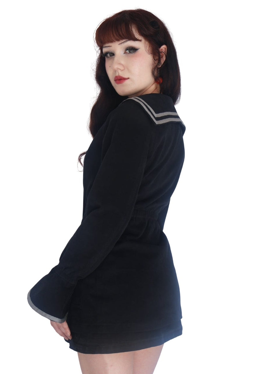 Crafted from high-quality black cotton twill, this piece is fully lined for a structured yet comfortable fit. It features a perfectly fitted elastic waistband that cinches at the natural waist, creating a flattering silhouette. The flared sleeves include sewn-in elastic to keep them in place without slipping, while a row of buttons runs up the front for a classic touch. Finished with a sailor-style collar and cape, this design blends timeless charm with subtle edge.